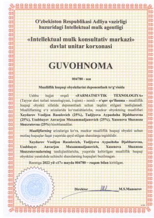 | 5319 | №004779 | O‘quv qo‘llanma -"TAYYOR DORI TURLARI TEXNOLOGIYASI" (I-qism) | Xaydarov Vosiljon Rasulovich (25%), Sharipova Saodat Tursunbayevna (25%), Raximova Oygul Raxim qizi (25%), Nusratova Nozima Narzulloyevna (25%) | Xaydarov Vosiljon Rasulovich, Sharipova Saodat Tursunbayevna, Raximova Oygul Raxim qizi, Nusratova Nozima Narzulloyevna | 05/17/2022 | ![]() |