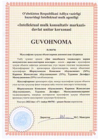 | 5314 | №004784 | Научно-инновационный проект-"БИОЩИТ", "BIOSHIELD", "BIOQALQON" (Технология по обеззараживанию фито патогенов и насекомых вредителей, электромагнитным полем высокой частоты) | Иссаева Нилуфар Убайдуллаевна (80%), Дехкамбаев Рихсибой Иргашевич (10%), Изамов Ровшан Шавкатович (10%) | ООО "HITIN" | 05/17/2022 | ![]() |