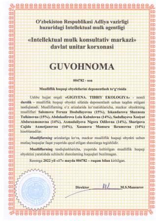 | 5316 | №004782 | Darslik - "GIGIYENA. TIBBIY EKOLOGIYA" | Salomova Feruza Ibodullayevna (15%), Iskandarova Shaxnoza Tulkinovna (15%), Abdukadirova Lola Kabulovna (14%), Sadullayeva Xosiyat Abduraxmonovna (14%), Axmadaliyeva Nigora Odilovna (14%), Sharipova Cajida Axmetjanovna (14%), Xasanova Mamura Ikramovna (14%) | Salomova Feruza Ibodullayevna, Iskandarova Shaxnoza Tulkinovna, Abdukadirova Lola Kabulovna, Sadullayeva Xosiyat Abduraxmonovna, Axmadaliyeva Nigora Odilovna, Sharipova Cajida Axmetjanovna, Xasanova Mamura Ikramovna | 05/17/2022 | ![]() |