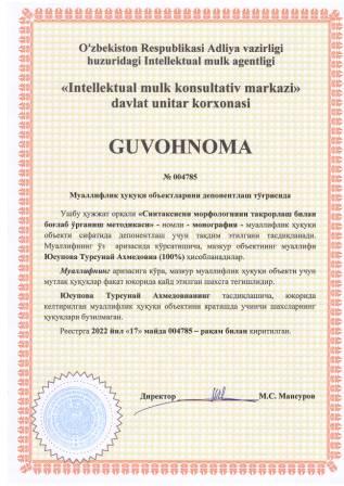 | 5313 | №004785 | Монография - "Синтаксисни морфологияни такрорлаш билан боғлаб ўрганиш методикаси" | Юсупова Турсунай Ахмедовна (100%) | Юсупова Турсунай Ахмедовна | 05/17/2022 | ![]() |