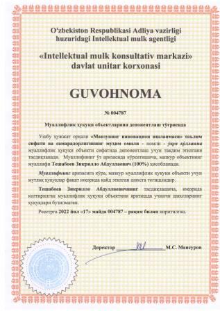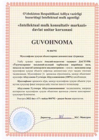 | 5306 | №004792 | Жамланма асар - "Амалий-педагогик тадқиқот ДАСТУРИ: "Ўқувчиларнинг маънавий-ахлоқий тарбиялаш жараёнида оила, маҳалла ва мактаб ҳамкорлиги квалиметрияси" | Абдуллаева Гулчехра Абдуллажоновна (100%) | Абдуллаева Гулчехра Абдуллажоновна | 05/17/2022 | ![]() |