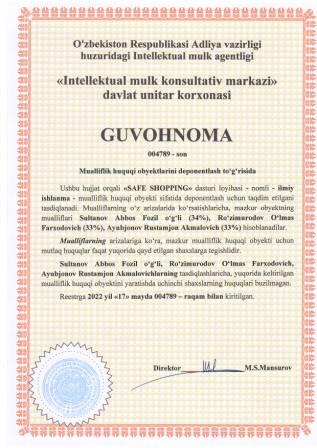 | 5309 | №004789 | Ilmiy ishlanma - "SAFE SHOPPING" dasturi loyihasi | Sultanov Abbos Fozil o‘g‘li (34%), Ro‘zimurodov O‘lmas Farxodovich (33%), Ayubjonov Rustamjon Akmalovich (33%) | Sultanov Abbos Fozil o‘g‘li, Ro‘zimurodov O‘lmas Farxodovich, Ayubjonov Rustamjon Akmalovich | 05/17/2022 | ![]() |