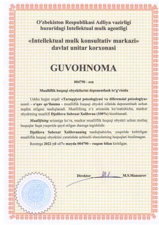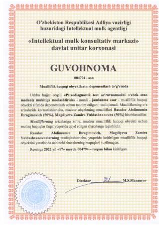 | 5304 | №004794 | Jamlanma asar - "Psixodiagnostik test so‘rovnomasini o‘zbek etno madaniy muhitiga moslashtirish" | Rasulov Abdimumin Ibragimovich (50%), Magdiyeva Zamira Yuldashxanovna (50%) | Rasulov Abdimumin Ibragimovich, Magdiyeva Zamira Yuldashxanovna | 05/17/2022 | ![]() |