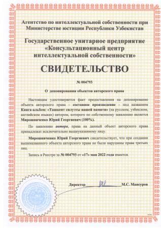 | 5305 | №004793 | Составное произведение - "Книга-альбом: «Ташкент силуэты нашей памяти" (на русском, узбекском, английском языках) | Мирошниченко Юрий Георгиевич (100%) | Мирошниченко Юрий Георгиевич | 05/17/2022 | ![]() |