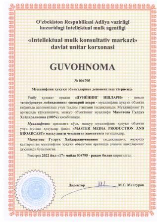 | 5303 | №004795 | Телекўрсатув лойиҳасининг сценарий асари -"ДУНЁНИНГ ИШЛАРИ" | Маматова Гулрух Хайдаралиевна (100%) | "MASTER MEDIA PRODUCTION AND BROADCAST" масъулияти чекланган жамияти | 05/17/2022 | ![]() |