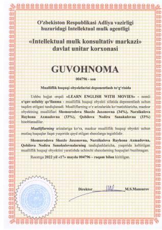 | 5302 | №004796 | O‘quv-uslubiy qo‘llanma - "LEARN ENGLISH WITH MOVIES" | Shomurodova Shaxlo Jaxonovna (34%), Narzikulova Rayhona Axmadovna (33%), Qobilova Nodira Sanakulovna (33%) | Shomurodova Shaxlo Jaxonovna, Narzikulova Rayhona Axmadovna, Qobilova Nodira Sanakulovna | 05/17/2022 | ![]() |