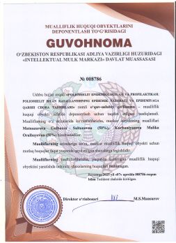 536 | №008786 | O’quv-uslubiy qo‘llanma– "POLIOMIELIT EPIDEMIOLOGIYASI VA PROFILAKTIKASI. POLIOMIELIT BILAN KASALLANISHNING EPIDEMIK NAZORATI VA EPIDEMIYAGA QARSHI CHORA TADBIRLARI" | Matnazarova Gulbaxor Sultanovna (50%), Kurbaniyazova Malika Oralbayevna (50%) | Matnazarova Gulbaxor Sultanovna, Kurbaniyazova Malika Oralbayevna | 04/07/2025 | ![]() |