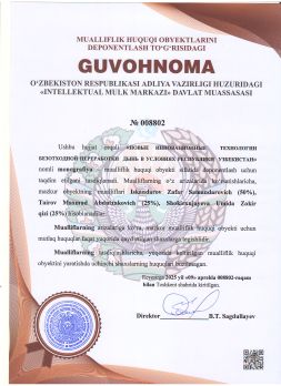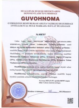 521 | №008802 | Monografiya –"НОВЫЕ ИННОВАЦИОННЫЕ ТЕХНОЛОГИИ БЕЗОТХОДНОЙ ПЕРЕРАБОТКИ ДЫНЬ В УСЛОВИЯХ РЕСПУБЛИКИ УЗБЕКИСТАН" | Iskandarov Zafar Samandarovich (50%), Tairov Maxmud Abdulxakovich (25%), Shokirxujayeva Umida Zokir qizi (25%) | Iskandarov Zafar Samandarovich, Tairov Maxmud Abdulxakovich, Shokirxujayeva Umida Zokir qizi | 04/09/2025 | ![]() |