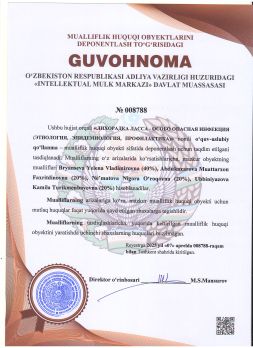 533 | №008789 | O‘quv-uslubiy qo‘llanma – "ПАПИЛЛОМАВИРУСНАЯ ИНФЕКЦИЯ (ЭТИОЛОГИЯ, ЭПИДЕМИОЛОГИЯ И ПРОФИЛАКТИКА)" | Raximov Ravshan Abdullayevich (25%), Bryanseva Yelena Vladimirovna (25%), Kurbaniyazova Malika Oralbayevna (25%), Axmedova Shaxnoza Xayrullayevna (25%) | Raximov Ravshan Abdullayevich, Bryanseva Yelena Vladimirovna, Kurbaniyazova Malika Oralbayevna, Axmedova Shaxnoza Xayrullayevna | 04/07/2025 | ![]() |