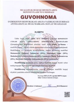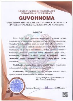 531 | №008791 | O’quv-uslubiy qo‘llanma– "OROL BO‘YI HUDUDIDA AYOLLAR REPRODUKTIV A’ZOLARI XAVFLI O’SMALARINING EPIDEMIOLOGIK XUSUSIYATLARI" | Matnazarova Gulbaxor Sultanovna (20%), Madreimov Amet (20%), Madenbayeva Gulchexra Ilxamovna (20%), Xamzayeva Nilufar Toshtemirovna (20%), Mavlyanov Jaloliddin Abdivaxidovich (20%) | Matnazarova Gulbaxor Sultanovna, Madreimov Amet, Madenbayeva Gulchexra Ilxamovna, Xamzayeva Nilufar Toshtemirovna, Mavlyanov Jaloliddin Abdivaxidovich | 04/07/2025 | ![]() |