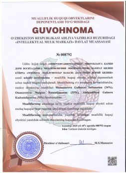522 | №008801 | Ilmiy ishlanma (loyiha) – "УЗУМ ЕТИШТИРИШДА ХОСИЛДОРЛИКНИ 50% ГАЧА ОШИРИШ УСУЛИ" | Maxsudov Sharofiddin Faxriddin o‘g‘li (100%) | Maxsudov Sharofiddin Faxriddin o‘g‘li | 04/09/2025 | ![]() |