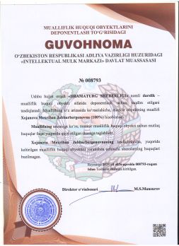 529 | №008793 | Darslik –"DRAMATURG SHEBERLIGI" | Xojanova Mexriban Jabbarbergenovna (100%) | Xojanova Mexriban Jabbarbergenovna | 04/07/2025 | ![]() |