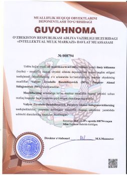 528 | №008794 | Ilmiy ishlanma (loyiha) – "П ШАКЛИДАГИ ШТАНГА ГРИФИ" | Valiyev Ziyodullo Baxshilloyevich (50%), Parpiyev Akmal Sidiqjonovich (50%) | Valiyev Ziyodullo Baxshilloyevich, Parpiyev Akmal Sidiqjonovich | 04/07/2025 | ![]() |