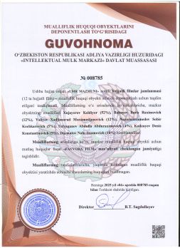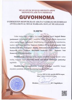 539 | №008783 | Hujjatli filmlar jamlanmasi (4 ta hujjatli film) – "ILM-TARAQQIYOT YO‘LIDA" | Xujayorov Keldiyor (52%), Babayev Boris Raximovich (38%), Kodzayev Denis Konstantinovich (10%) | «FAVVORA FILM» mas’uliyati cheklangan jamiyati | 04/04/2025 | ![]() |