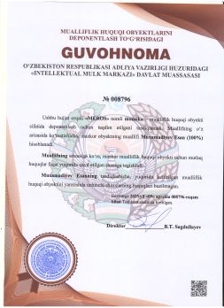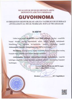 527 | №008795 | Ilmiy ishlanma (loyiha) – "KOD 093" | Abduxamidov Xurshid Abdujabbarovich (100%) | Abduxamidov Xurshid Abdujabbarovich | 04/09/2025 | ![]() |