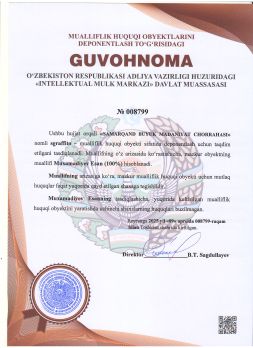 524 | №008799 | Sgraffito – "SAMARQAND BUYUK MADANIYAT CHORRAHASI" | Muxamadiyev Esan (100%) | Muxamadiyev Esan | 04/09/2025 | ![]() |