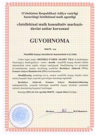 | 5420 | №004678 | Darslik - "HOZIRGI O‘ZBEK ADABIY TILI" (Leksikologiya frazeologiya, leksikografiya) | Berdaliyev Abduvali (75%), Ermatov Ixtiyor Rizakulovich (25%) | Berdaliyev Abduvali, Ermatov Ixtiyor Rizakulovich | 04/14/2022 | ![]() |