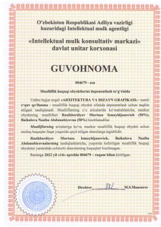 | 5419 | №004679 | O‘quv qo‘llanma -"ARXITEKTURA VA DIZAYN GRAFIKASI" | Razikberdiyev Murtaza Ismayldjanovich (50%), Baikulova Nasiba Abdunabiyevna (50%) | Razikberdiyev Murtaza Ismayldjanovich (50%), Baikulova Nasiba Abdunabiyevna (50%) | 04/14/2022 | ![]() |