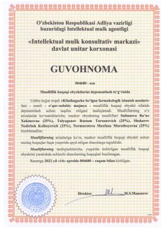 | 5418 | №004680 | O‘quv-uslubiy majmua - "Klinikagacha bo‘lgan farmakologik izlanish asoslari" fani | Sultanova Ra’no Xakimovna (25%), Tulyaganov Rustam Tursunovich (25%), Shakarov Nodirbek Kolboyevich (25%), Normurotova Maxfuza Murotboyevna (25%) | Sultanova Ra’no Xakimovna, Tulyaganov Rustam Tursunovich, Shakarov Nodirbek Kolboyevich, Normurotova Maxfuza Murotboyevna | 04/14/2022 | ![]() |
