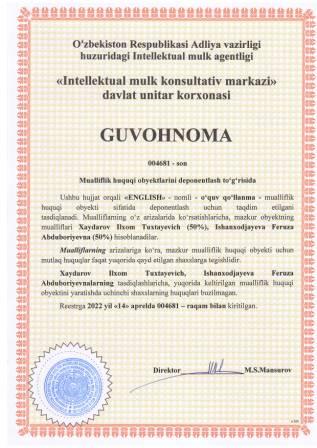 | 5417 | №004681 | O‘quv qo‘llanma -"ENGLISH" | Xaydarov Ilxom Tuxtayevich (50%), Ishanxodjayeva Feruza Abduboriyevna (50%) | Xaydarov Ilxom Tuxtayevich, Ishanxodjayeva Feruza Abduboriyevna | 04/14/2022 | ![]() |