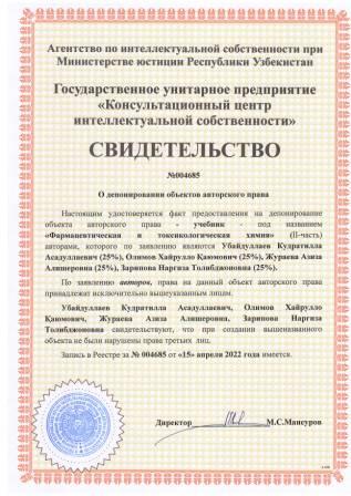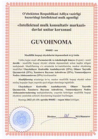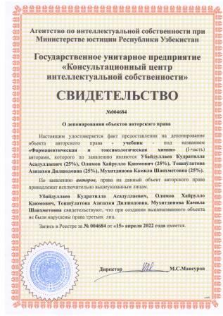 | 5415 | №004683 | Darslik - "Farmatsevtik va toksikologik kimyo" (II-qism) | Ubaydullayev Kudratilla Asadullayevich (25%), Olimov Xayrullo Qayumovich (25%), Xusainova Rayxona Ashrafovna (25%), Yunusxodjayeva Nodira Abduxamitovna (25%) | Ubaydullayev Kudratilla Asadullayevich, Olimov Xayrullo Qayumovich, Xusainova Rayxona Ashrafovna, Yunusxodjayeva Nodira Abduxamitovna | 04/15/2022 | ![]() |