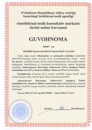 | 5412 | №004686 | O‘quv-uslubiy majmua - "Matematika va matematik statistika" (modulidan 60910700-Farmatsiya turlari bo‘yicha ta’lim yo’nalishitalabalari uchun) | Abduraxmonov Baxromjon Alisherovich (34%), Samigova Nodira Xamidullayevna (33%), Sunatova Dilfuza Abatovna (33%) | Abduraxmonov Baxromjon Alisherovich, Samigova Nodira Xamidullayevna, Sunatova Dilfuza Abatovna | 04/15/2022 | ![]() |