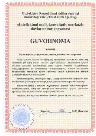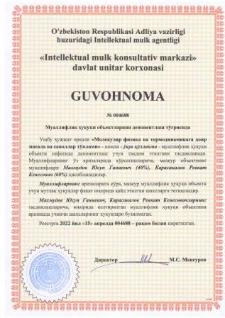 | 5410 | №004688 | O‘quv qo‘llanma -"Молекуляр физика ва термодинамикага доир масала ва саволлар тўплами" | Махмудов Юсуп Ганиевич (40%), Карасакалов Ревкат Кенесович (60%) | Махмудов Юсуп Ганиевич, Карасакалов Ревкат Кенесович | 04/15/2022 | ![]() |