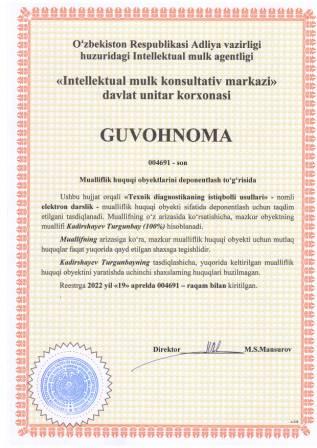 | 5407 | №004691 | Elektron darslik - "Texnik diagnostikaning istiqbolli usullari" | Kadirshayev Turgunbay (100%) | Kadirshayev Turgunbay | 04/19/2022 | ![]() |