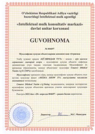 | 5401 | №004697 | Кўп қисмли сериалнинг сценарий асари - "ҚЎЛИМДАН ТУТ" | Umarov Dilshod Nasim o‘g‘li (100%) | "MEDIA SHOW TV" маъсулияти чекланган жамияти | 04/20/2022 | ![]() |