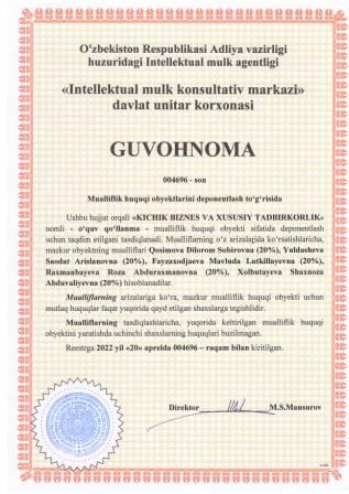 | 5402 | №004696 | O‘quv qo‘llanma -"KICHIK BIZNES VA XUSUSIY TADBIRKORLIK" | Qosimova Dilorom Sobirovna (20%), Yuldasheva Saodat Arislanovna (20%), Fayzaxodjaeva Mavluda Lutkillayevna (20%), Raxmanbayeva Roza Abduraxmanovna (20%), Xolbutayeva Shaxnoza Abduvaliyevna (20%) | Qosimova Dilorom Sobirovna, Yuldasheva Saodat Arislanovna, Fayzaxodjaeva Mavluda Lutkillayevna, Raxmanbayeva Roza Abduraxmanovna, Xolbutayeva Shaxnoza Abduvaliyevna | 04/20/2022 | ![]() |