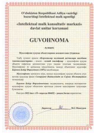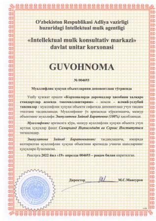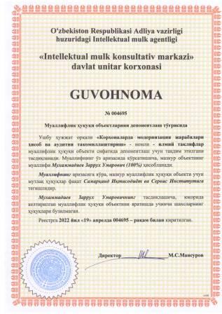 | 5406 | №004692 | Илмий таклифлар - "Корхоналар молиявий активлари ҳисобини такомиллаштириш" | Боронов Бобур Фарходович (100%) | Самарқанд Иқтисодиёт ва Сервис Институти | 04/19/2022 | ![]() |