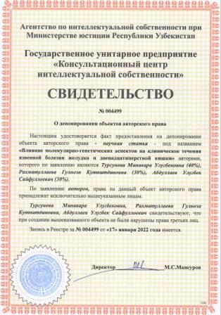 | 5600 | №004499 | Научная статья – "Влияние молекулярно-генетических аспектов на клиническое течения язвенной болезни желудка и двенадцатиперстной кишки" | Турсунова Минавара Улугбековна (40%), Рахматуллаева Гулноза Кутпитдиновна (30%), Абдуллаев Улугбек Сайфуллоевич (30%) | Турсунова Минавара Улугбековна, Рахматуллаева Гулноза Кутпитдиновна, Абдуллаев Улугбек Сайфуллоевич | 01/17/2022 | ![]() |