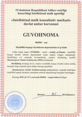 | 5598 | №004501 | Uslubiy qo‘llanma - "TURIZM" | Shomurzayeva Nasiba Xoshimovna (100%) | Shomurzayeva Nasiba Xoshimovna | 01/17/2022 | ![]() |
