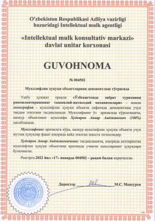 | 5597 | №004502 | Монография - "Ўзбекистонда зиёрат туризмини ривожлантиришнинг ташкилий-иқтисодий механизмлари" | Худояров Анвар Аиджанович (100%) | Худояров Анвар Аиджанович | 01/17/2022 | ![]() |