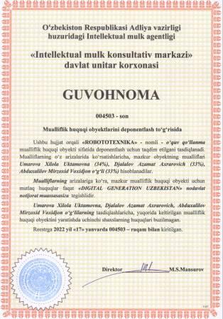 | 5596 | №004503 | O‘quv qo‘llanma -"ROBOTOTEXNIKA" | Umarova Xilola Uktamovna (34%), Djalalov Azamat Axrarovich (33%), Abduxalilov Mirzoxid Voxidjon o‘g‘li (33%) | "DIGITAL GENERATION UZBEKISTAN" nodavlat notijorat muassasasi | 01/17/2022 | ![]() |