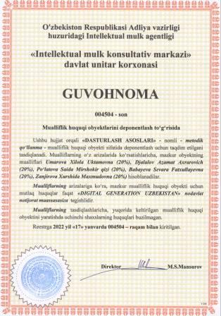| 5595 | №004504 | Metodik qo‘llanma-"DASTURLASH ASOSLARI" | Umarova Xilola Uktamovna (20%), Djalalov Azamat Axrarovich (20%), Po‘latova Saida Mirshokir qizi (20%), Babayeva Sevara Fatxullayevna (20%), Zanjirova Xurshida Maxmudovna (20%) | "DIGITAL GENERATION UZBEKISTAN" nodavlat notijorat muassasasi | 01/17/2022 | ![]() |