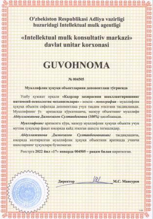 | 5594 | №004505 | Монография - "Кадрлар захирасини шакллантиришнинг ижтимоий-психологик механизмлари" | Абдуллажанова Дилнозахон Султанбековна (100%) | Абдуллажанова Дилнозахон Султанбековна | 01/17/2022 | ![]() |