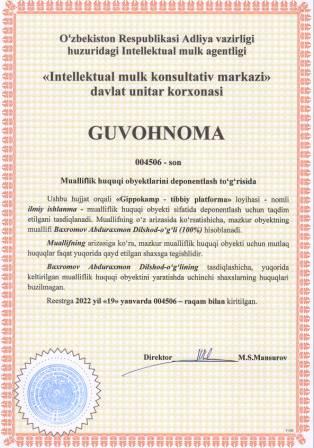 | 5593 | №004506 | ilmiy ishlanma - "Gippokamp - tibbiy platforma" loyihasi | Baxromov Abduraxmon Dilshod-o‘g‘li (100%) | Baxromov Abduraxmon Dilshod-o‘g‘li | 01/19/2022 | ![]() |