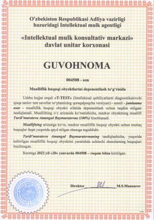 | 5591 | №004508 | Jamlanma asar - "T-TEST" (Intellektual qobiliyatlarni diagnostikalovchi qisqa tanlov test savollar to‘plamining qoraqalpoqcha versiyasi) | Turdi’muratova Amangul Baymuratovna (100%) | Turdi’muratova Amangul Baymuratovna | 01/20/2022 | ![]() |