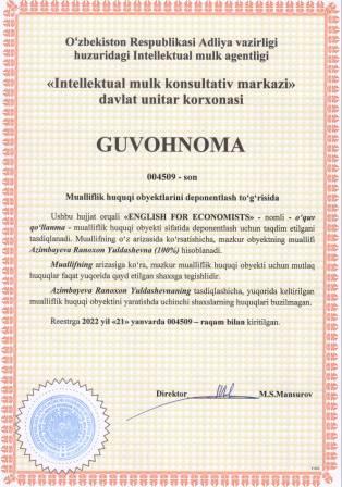 | 5590 | №004509 | O‘quv qo‘llanma -"ENGLISH FOR ECONOMISTS" | Azimbayeva Ranoxon Yuldashevna (100%) | Azimbayeva Ranoxon Yuldashevna | 01/21/2022 | ![]() |
