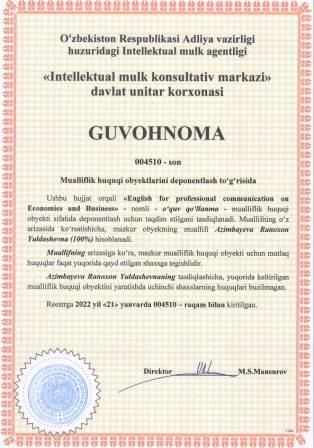 | 5589 | №004510 | O‘quv qo‘llanma -"English for professional communication on Economics and Business" | Azimbayeva Ranoxon Yuldashevna (100%) | Azimbayeva Ranoxon Yuldashevna | 01/21/2022 | ![]() |