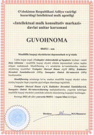 | 5588 | №004511 | ilmiy ishlanma - "Toshqulov elektroshokli qo‘lqoplari" loyihasi | Toshqulov Sherzod Hasan o‘g‘li (80%), Kuldashev Ikrombek Xamidullaevich (10%), Sanaqulov Otabek Mo‘minovich (10%) | Toshqulov Sherzod Hasan o‘g‘li, Kuldashev Ikrombek Xamidullaevich, Sanaqulov Otabek Mo‘minovich | 01/21/2022 | ![]() |