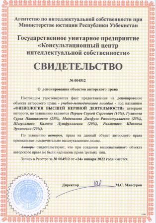 | 5587 | №004512 | Учебно-методическое пособие -"ФИЗИОЛОГИЯ ВЫСШЕЙ НЕРВНОЙ ДЕЯТЕЛЬНОСТИ" | Перцов Сергей Сергеевич (10%), Гулямова Сурая Паттаховна (25%), Мадазизова Дилфуза Рахматуллаевна (25%), Шагулямова Камола Лутфуллаевна (20%), Рахмонова Шахноза Эркиновна (20%) | Перцов Сергей Сергеевич, Гулямова Сурая Паттаховна, Мадазизова Дилфуза Рахматуллаевна, Шагулямова Камола Лутфуллаевна, Рахмонова Шахноза Эркиновна | 01/24/2022 | ![]() |