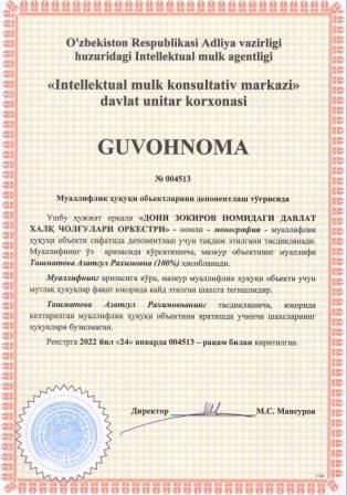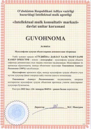 | 5585 | №004514 | Монография - "СЎҒДИЁНА" ДАВЛАТ ХАЛҚ ЧОЛҒУЛАРИ КАМЕР ОРКЕСТРИ | Ташматова Азатгул Рахимовна (100%) | Ташматова Азатгул Рахимовна | 01/24/2022 | ![]() |
