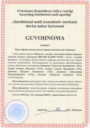| 5584 | №004515 | Услубий қўлланма - "Маҳалла - сектор - халқ қабулхонаси маҳалла тамоили асосида ҳамкорлик ИНСОН ҚАДРИ УЧУН" | Матибаев Тасполат Балтабаевич (25%), Саидов Рустам Инамович (15%), Сеитов Азамат Пулатович (15%), Эрматов Шухрат Тешабаевич (15%), Бустонов Абдусаттор Рахманбердиевич (15%), Холиқов Тошпўлот Суюнович (15%) | Матибаев Тасполат Балтабаевич, Саидов Рустам Инамович, Сеитов Азамат Пулатович, Эрматов Шухрат Тешабаевич, Бустонов Абдусаттор Рахманбердиевич, Холиқов Тошпўлот Суюнович | 01/24/2022 | ![]() |