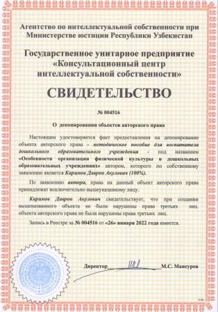 | 5583 | №004516 | Методическое пособие для воспитателя дошкольного образовательного учреждения - "Особенности организации физической культуры в дошкольных образовательных учреждениях" | Каримов Даврон Акулович (100%) | Каримов Даврон Акулович | 01/26/2022 | ![]() |
