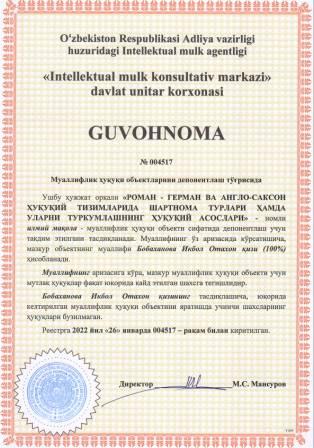 | 5582 | №004517 | Илмий мақола - "РОМАН - ГЕРМАН ВА АНГЛО-САКСОН ҲУҚУҚИЙ ТИЗИМЛАРИДА ШАРТНОМА ТУРЛАРИ ҲАМДА УЛАРНИ ТУРКУМЛАШНИНГ ҲУҚУҚИЙ АСОСЛАРИ" | Бобаханова Икбол Отахон қизи (100%) | Бобаханова Икбол Отахон қизи | 01/26/2022 | ![]() |