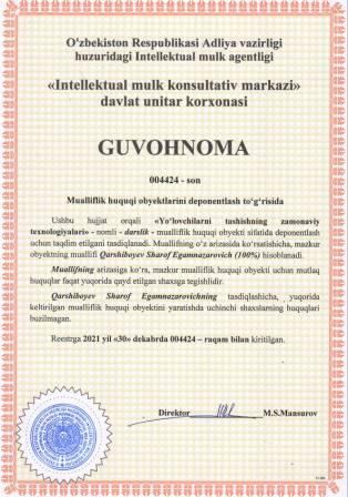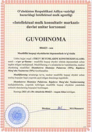 | 5672 | №004423 | O‘quv qo‘llanma -"TIKUV BUYUMLARINI KONSTRUKSIYALASH" | Shumkarova Shamsiya Pulatovna (50%), Rajabova Marg‘uba Nazimovna (50%) | Shumkarova Shamsiya Pulatovna, Rajabova Marg‘uba Nazimovna | 12/30/2021 | ![]() |