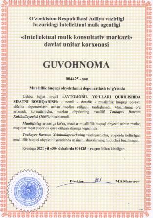 | 5670 | №004425 | Darslik - "AVTOMOBIL YO‘LLARI QURILISHIDA SIFATNI BOSHQARISH" | Tovboyev Baxrom Xabibullayevich (100%) | Tovboyev Baxrom Xabibullayevich | 12/30/2021 | ![]() |