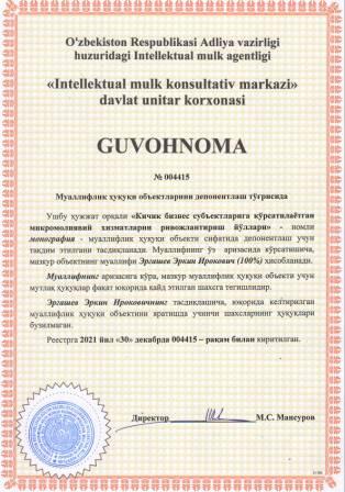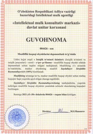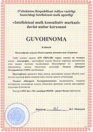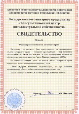 | 5675 | №004420 | Составное произведение - Каталог: "ПУТЬ ХЛЕБА НАСУЩНОГО" (Рисқ йўли) | Гиясов Шухрат Анварович (100%) | Гиясов Шухрат Анварович | 12/30/2021 | ![]() |